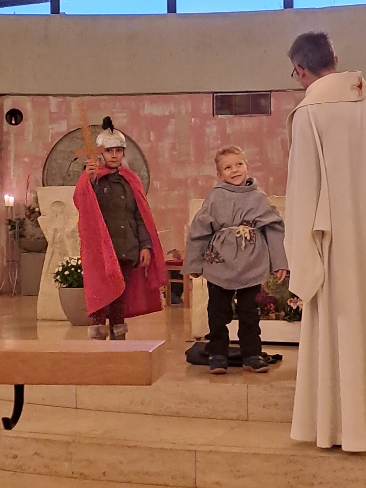 Der Gottesdienst wurde von unserem Pfarrer Herrn Adrian Latacz festlich eröffnet. Im Anschluss führten die Vorschulkinder der Gruppen Buschwindröschen und Schneeglöckchen ihr Martinsspiel vor, welches sie schon Wochen im Voraus geübt haben. Zum Abschluss sangen sie uns noch das Lied „Lichterkinder“ vor. Dafür gab es einen großen Applaus.